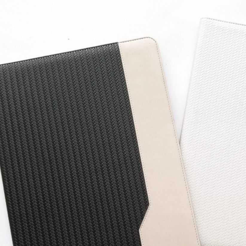 洗練された編み込み模様が特徴的なノートカバーです。A5サイズに対応し、ビジネスシーンや日常使いに最適な設計となっております。