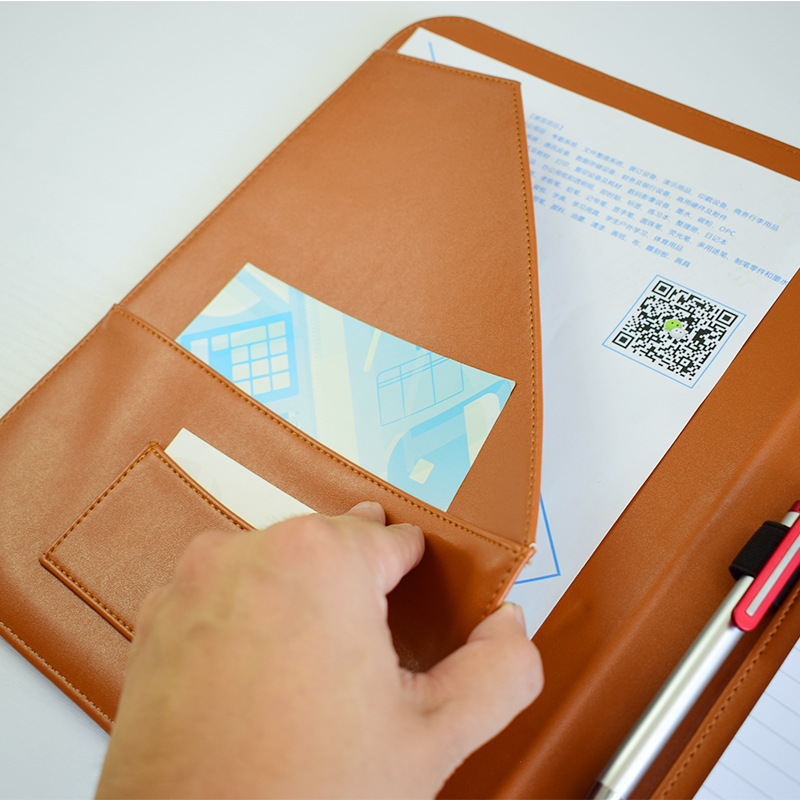 内側には書類や名刺を整理できる複数のポケットとペンホルダーを装備しており、会議や商談時に必要なものをスマートに持ち運べます。