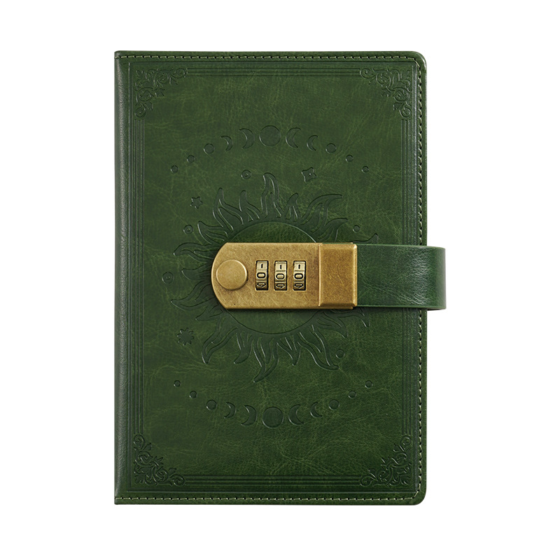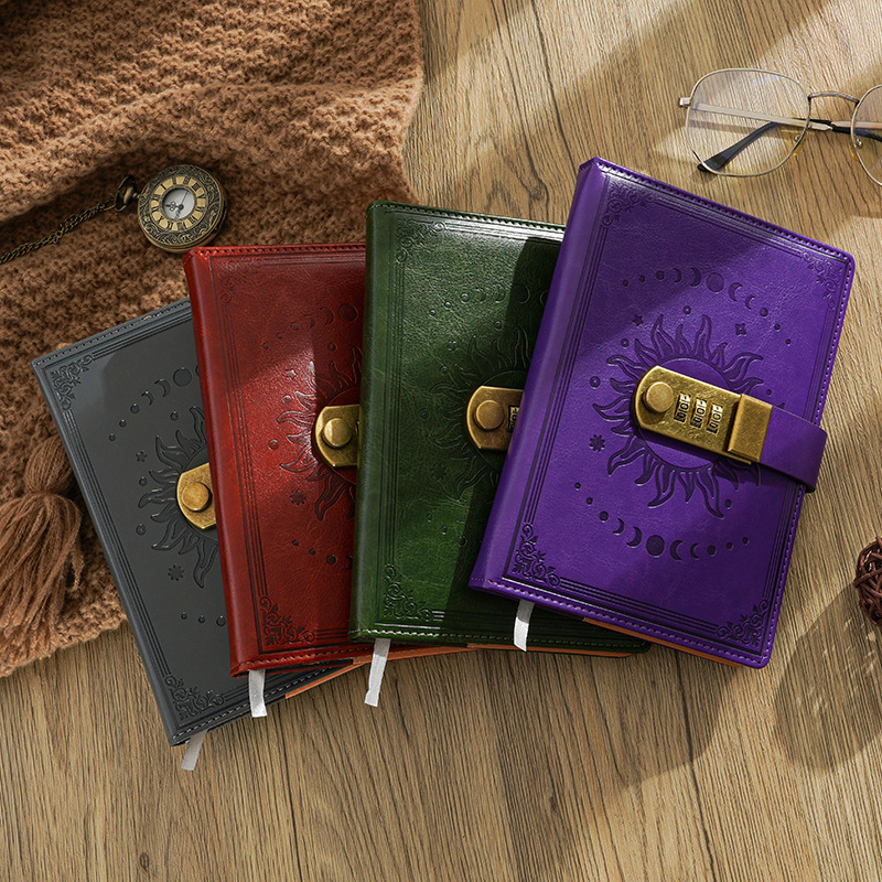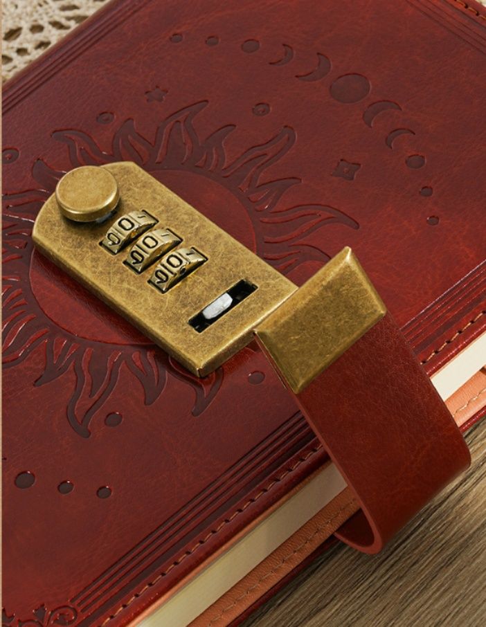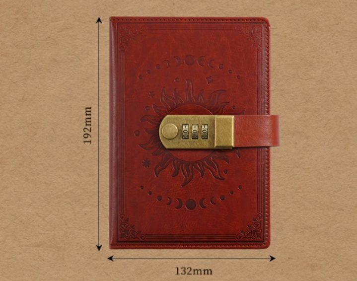 神秘的な月と太陽の型押しデザインが美しいノートカバーです。B6サイズに対応し、大切な手帳や日記をしっかり守ります。 表面には月の満ち欠けと太陽の紋様が立体的に刻まれ、アンティーク調の雰囲気を演出します。 三桁のダイヤル錠が付いているので、プライバシーを守りたい方に最適です。 合成皮革素材で手触りも滑らかで、長くお使いいただけます。 栞紐も付属しており、使い勝手も抜群です。