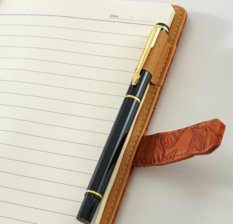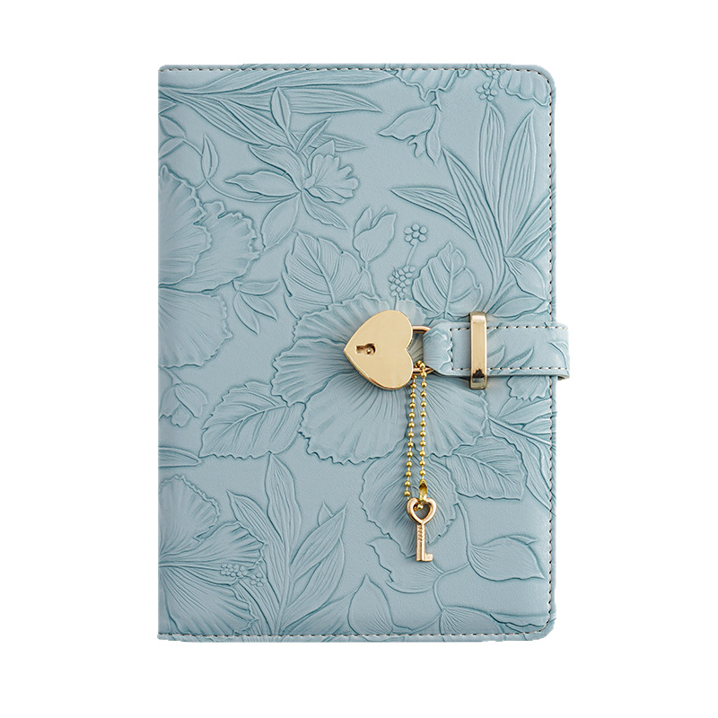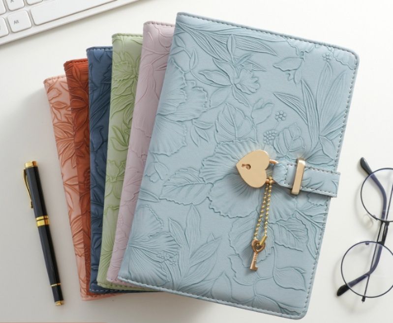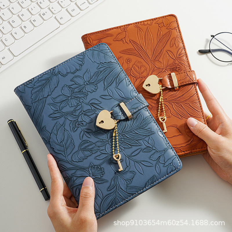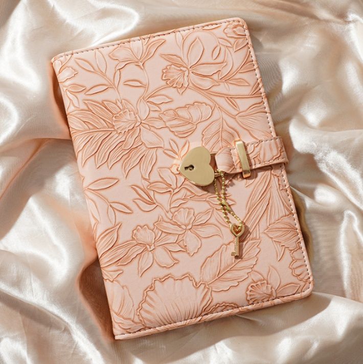 繊細な花柄の型押し加工が施された上品なノートカバーです。 表面全体に広がる立体的な植物模様が優雅な印象を与え、使うたびに心華やぐデザインに仕上げました。 ハート型の鍵と小さな鍵のチャームが付いた留め具がアクセントとなり、大切な記録をしっかり守ります。 A5サイズで手帳や日記帳にぴったりで、仕事にも私用にも幅広くお使いいただけます。 丁寧な縫製と上質な素材感で長くご愛用いただける逸品です。