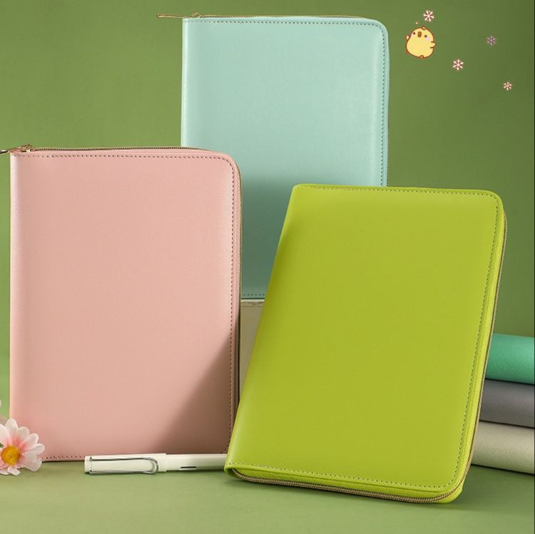 上質な合成皮革を使用したB6サイズを収納可能なノートカバーです。 金属リング綴じ仕様で、ページの追加や入れ替えが自由自在に行えます。 全面ファスナー開閉式で中身をしっかり保護し、筆記用具も一緒に収納できる実用的なデザインです。 やわらかな質感と丁寧なステッチが上品な印象を与え、仕事や学習の計画管理に最適なノートカバーとなっています。